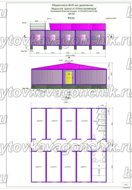 Фасады, план общежития на 30-40 человек, из 10 шт БК